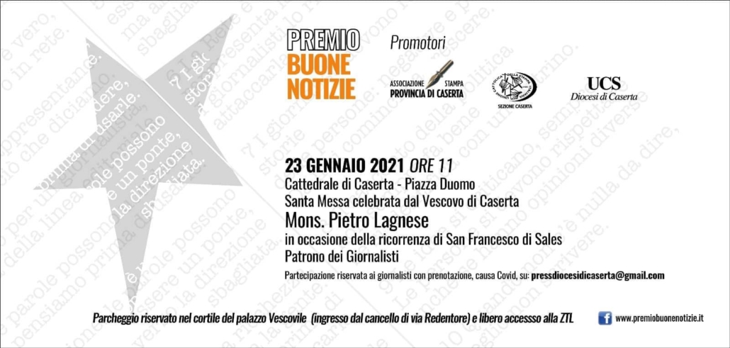 ”Nonostante tutto” nonostante il Covid, il Premio Buone Notizie tiene fede ai suoi appuntamenti. Il 23 gennaio ci sarà una santa messa con il nuovo vescovo di Caserta Pietro Lagnese nella Cattedrale diocesana alle 11 e al termine una conferenza stampa con il pastore, nella Biblioteca del Seminario, alla sua prima uscita pubblica in città. sarà anche l’occasione per annunciare le novità del Premio